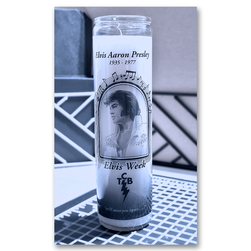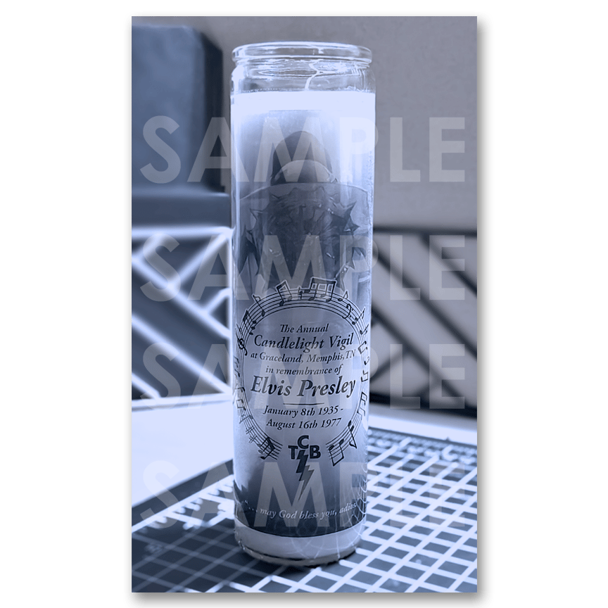 Glass prayer candles for the annual Candlelight Vigil at Graceland. These candles are standard 8" wax prayer candles in glass jars with my custom translucent design that allows the glow of the candle's flame to glow brightly. The candle's design features my original Elvis paintings and a quote from one of Elvis' final concerts across the bottom.